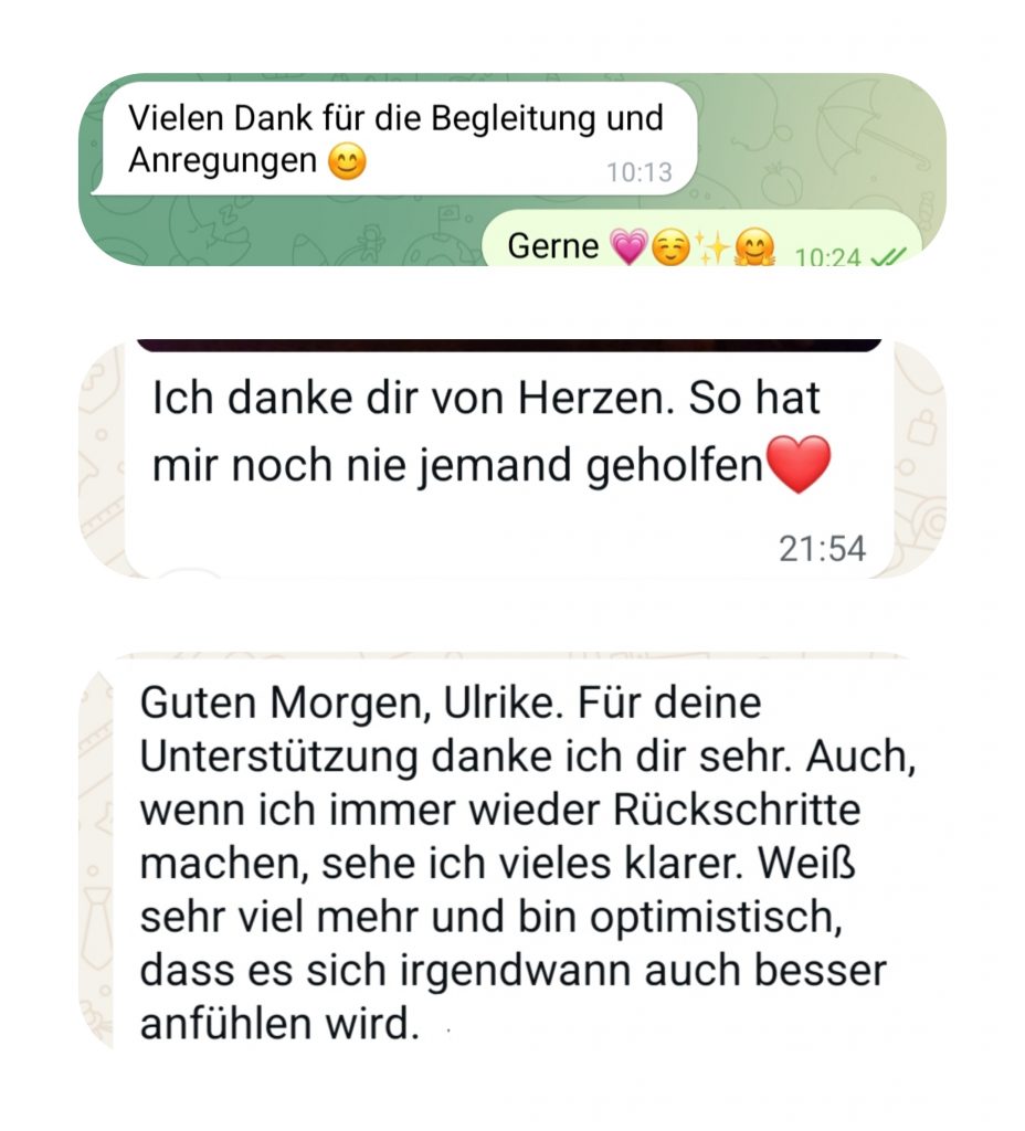 „Vielen Dank fuer die letzte Sitzung bei dir! Seit wir diesen Prozess gemacht haben, faellt es mir auf einmal sehr leicht, meine Beduerfnisse zu aeußern. Ich kann ganz klar sagen, was ich brauche und dies auch ohne Probleme ausdruecken und einfordern. Dies war fuer mich bisher nicht moeglich, vor allem auch das darüber sprechen.“